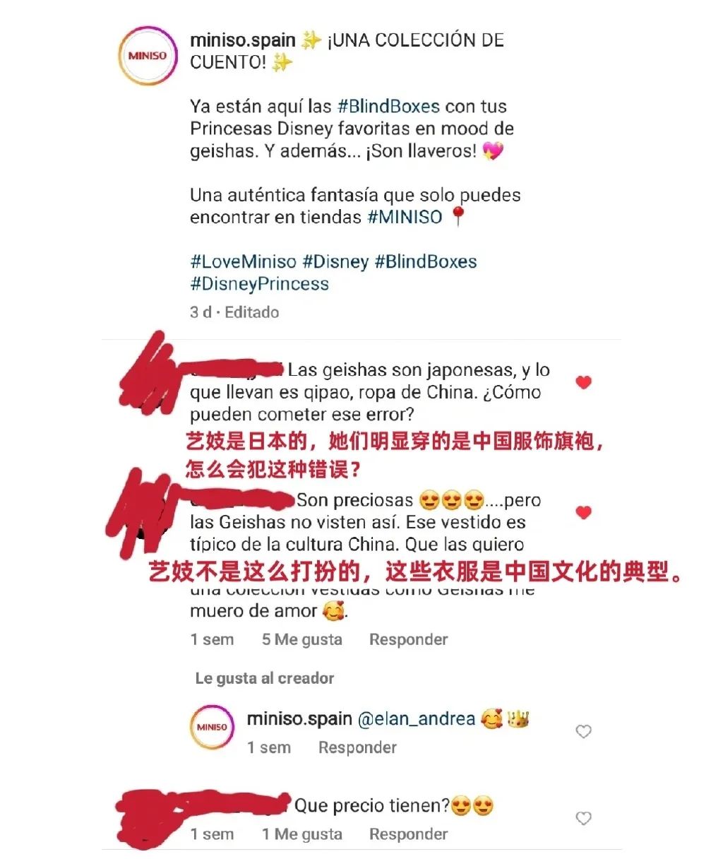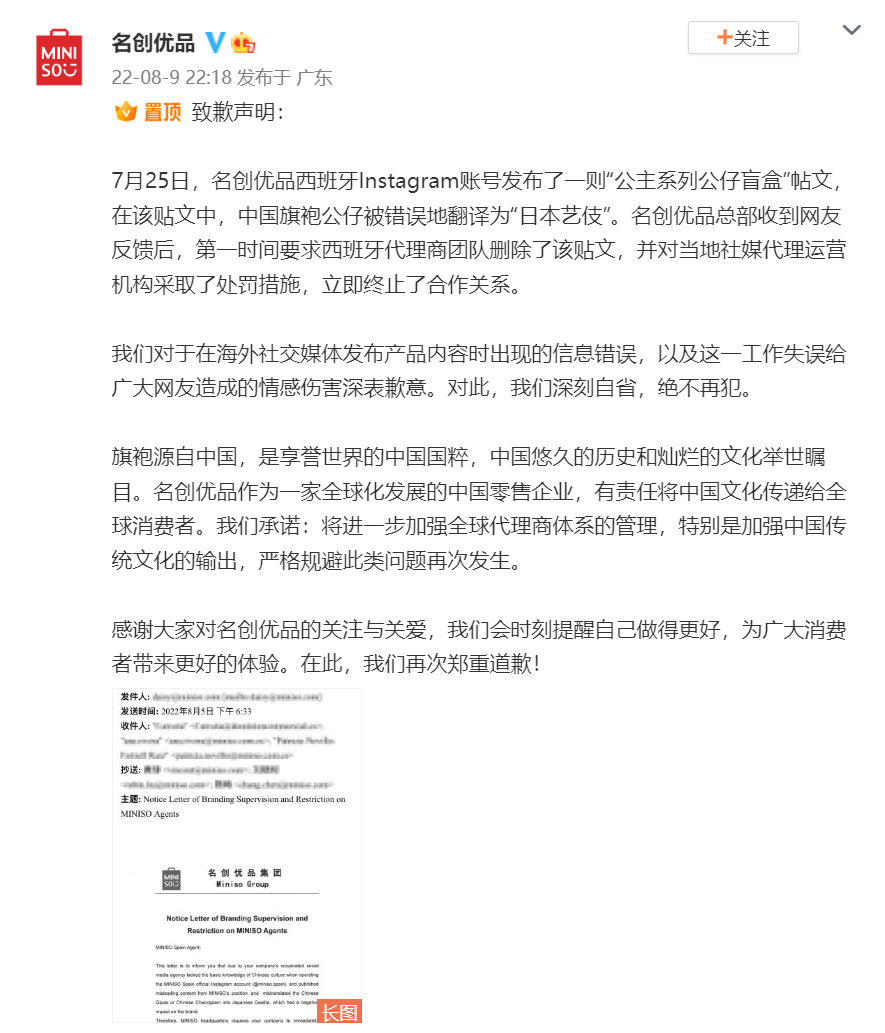 对此,8月9日晚间,@名创优品 发文致歉称,7月25日,名创优品西班牙Instagram账号发布了一则“公主系列公仔盲盒”帖文,在该贴文中,中国旗袍公仔被错误地翻译为“日本艺伎”。名创优品总部收到网友反馈后,第一时间要求西班牙代理商团队删除了该贴文,并对当地社媒代理运营机构采取了处罚措施,立即终止了合作关系。