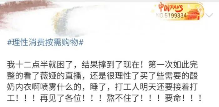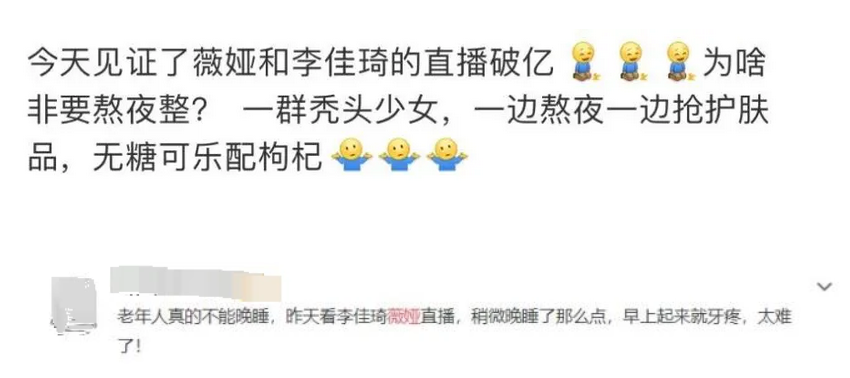 那这群秃头少女顶着黑眼袋,敷面膜熬夜看直播又如何呢?她们最大的收获就是困,薇娅与李佳琦的直播,将重头戏都放在后半夜,为了能够抢到心仪的产品,熬夜是必然。