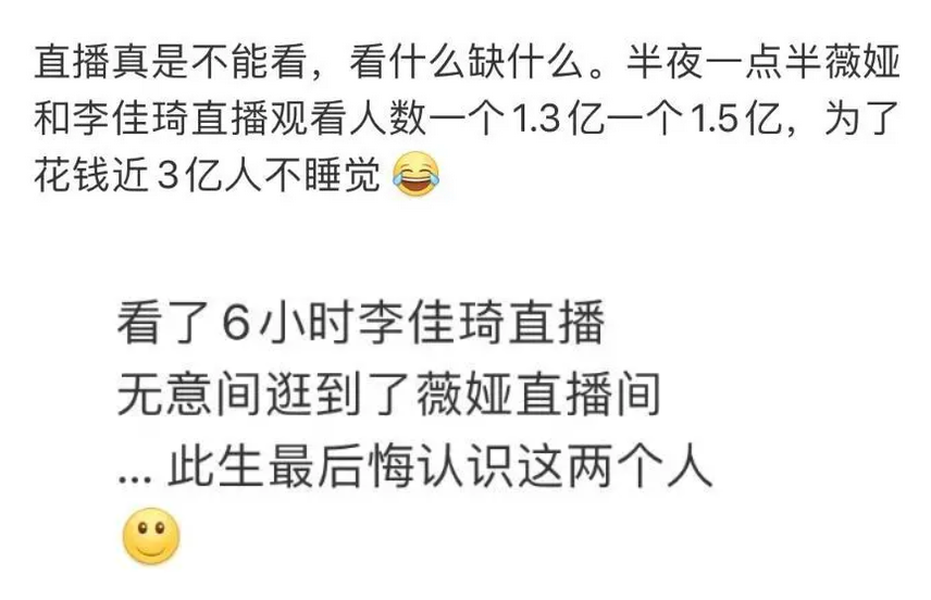 薇娅与李佳琦作为国内直播带货的头部网红,号召力可是相当强悍,不少网友在熬夜看直播后,表示此生最后悔认识的两个人:薇娅,李佳琦。