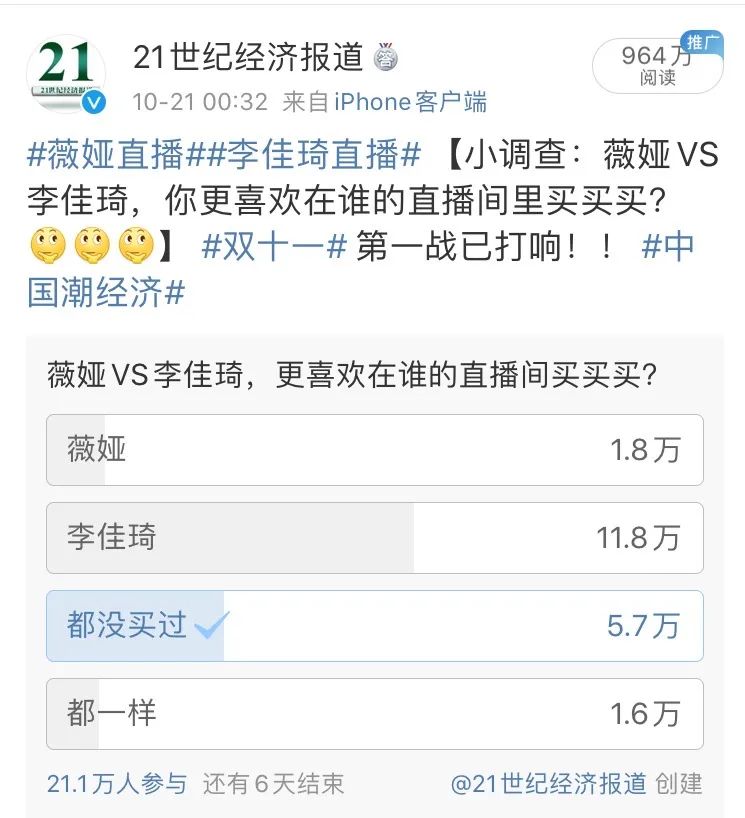 对于双十一的第一场直播,李佳也在直播结束后做出了总结。对于直播中出现的不足,向大家说声对不起。其次还是希所有女生都能理性消费,快乐购物。 据21世纪经济报道官方微博发布的调查显示,11.8万网友更喜欢在李佳琦的直播间“买买买”,1.8万网友则更倾向于在薇娅直播间购物,还有1.6万网友表示没有明显偏好。