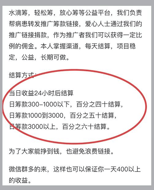 记者以求助人身份登陆某平台,一位网名为“爱心公益链接”的职业筹款推广人称,其拥有专门负责群推广的推手资料,每天会给病患进行水滴筹、轻松筹等链接推广,安排的推手每日的“业绩”约在1000元至3000元左右。如果日筹款低于300元,推广者不抽取分成;如果高于300元,则四六分成,“你四我六”。