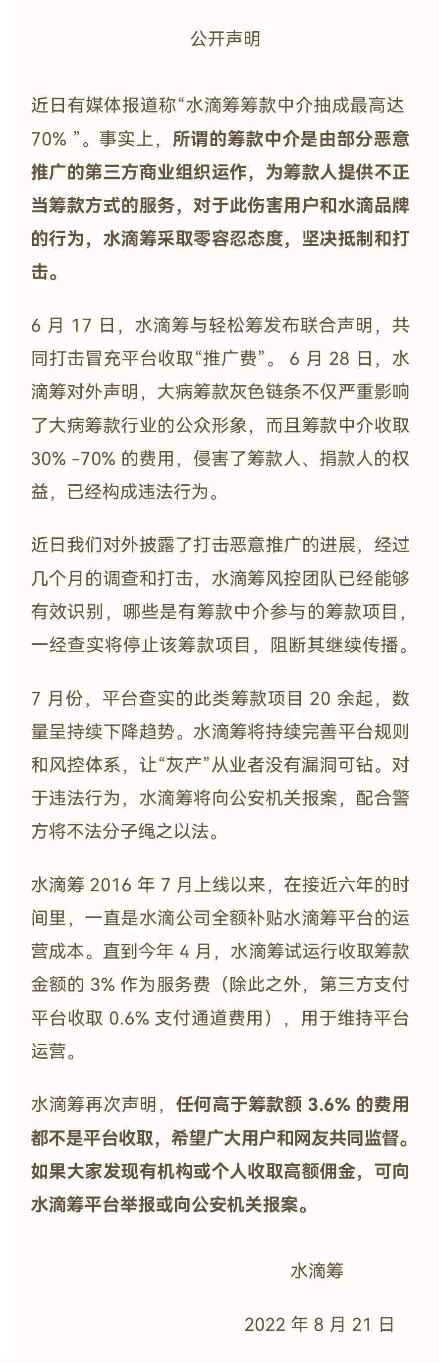 针对黑中介抽成70%登上热搜,水滴筹官方给出了回应。8月21日,水滴筹发布公开声明,表示所谓筹款中介是由部分恶意推广的第三方商业组织运作,为筹款人提供不正当筹款方式的服务。