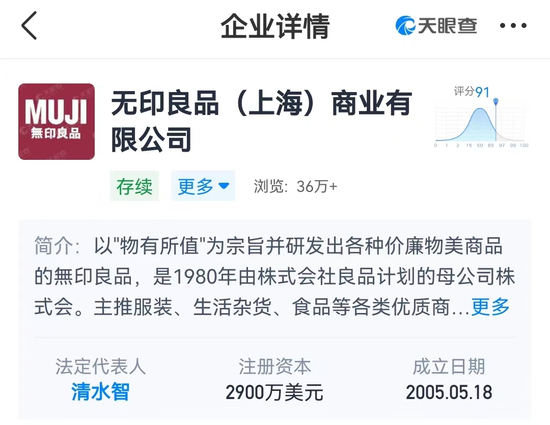 天眼查App显示,无印良品中国关联公司为无印良品(上海)商业有限公司,成立于2005年5月,法定代表人清水智,注册资本2900万美元,经营范围包括服装、服饰、鞋帽、饰品及珠宝饰品、日常生活用品零售、批发、网上零售等,由株式会社良品计画全资持股。目前,该公司已设立有320余家分公司,其中超300家为存续状态,分布于北京、上海、长沙、杭州等全国多个城市。