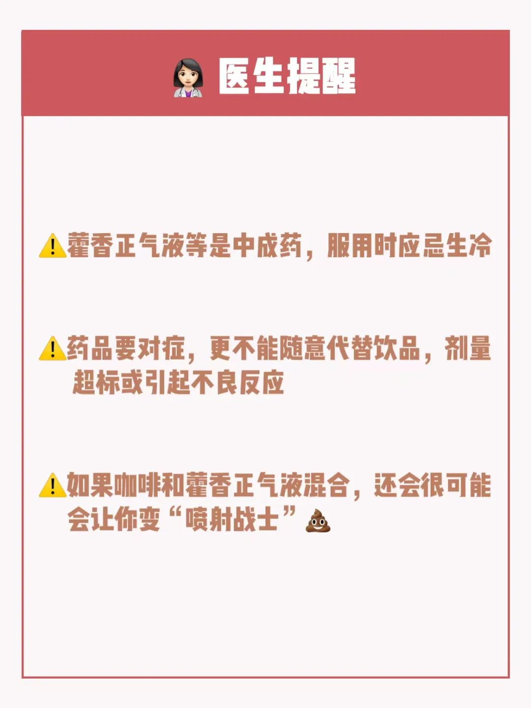 东南大学附属中大医院临床营养科主任医师金晖提醒:①藿香正气液等是中成药,服用时应忌生冷;②药品不能代替饮品,剂量超标或引起不良反应。