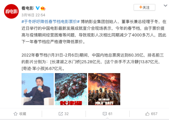 就在今年3月,博纳影业创始人于冬曾表示,今年春节档,由于票价提高与疫情期间经营困难等问题,导致观影人次同比减少了4000多万,下一年春节档应该严格遵守低票价。
