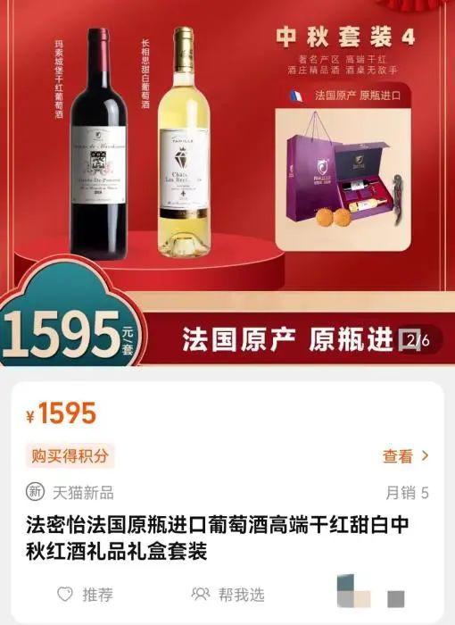 在天猫某红酒品牌旗舰店,一款售价1595元的中秋套装里,图片显示,包含了两瓶酒、两盒月饼和一把多功能开瓶器。不过,记者日前在该旗舰店查询发现,两瓶酒的合计售价仅为710元,这也意味着刨除两瓶酒,月饼等其他商品价值超过800元。