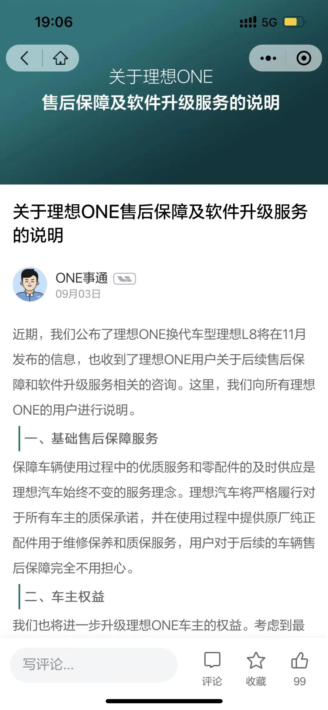 9月3日晚间,理想汽车通过官方APP发布《关于理想ONE售后保障及软件升级服务的说明》,表示理想L8发布后,理想ONE的基础售后保障不会受到影响,理想汽车将严格履行对于所有车主的质保承诺,并在使用过程中提供原厂纯正配件用于维修保养和质保服务。同时,考虑到最早提车的理想ONE车主已经使用接近三年,理想汽车决定将为所有理想ONE用户,在原有的“三年流量无忧方案”基础上,追加赠予三年流量无忧,每月20G免费流量,确保理想ONE车主的用车体验。对于理想ONE的OTA软件升级服务,理想汽车的软件团队也将持续开发和运营。