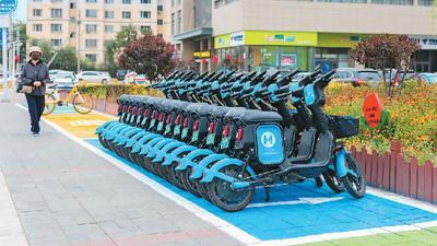 在内蒙古呼和浩特市,共享单车(助力车)专属停车位亮相街头。当地设置了黄色、绿色、蓝色等多种颜色的停车位,为不同品牌的共享单车(助力车)提供停放场所。 丁根厚摄(人民视觉)