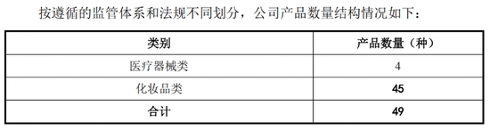 截至2021年12月31日,敷尔佳拥有24款医用敷料贴及贴、膜(含涂抹式面膜)类产品;6款喷雾产品;14款水、精华与乳液产品;1款冻干粉产品;2款凝胶产品;2款洁面产品。若按遵循的监管体系和法规划分,4款产品属于医疗器械类,45款产品属于化妆品类。