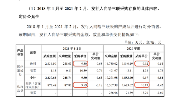 而上述产品的成本价均在10元左右。在回复深交所的问询函时,敷尔佳表示,2018年1月至2021年2月期间,敷尔佳向哈三联采购产成品并进行对外销售。2020年与2021年1~2月两期内,敷尔佳医用敷料的采购单价分别为9.12元/盒和9.80元/盒;面膜的采购单价分别为10.17元与9.99元。