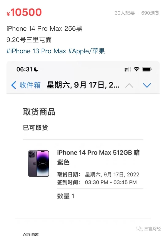 一位加价600元将手上的iPhone 14 Pro Max 256G版卖出的卖家告诉三言财经,自己发售当天就拿到货挂上链接,但是直到今天才卖出去。他直言这次买家很少,都差点以为自己卖不动了。