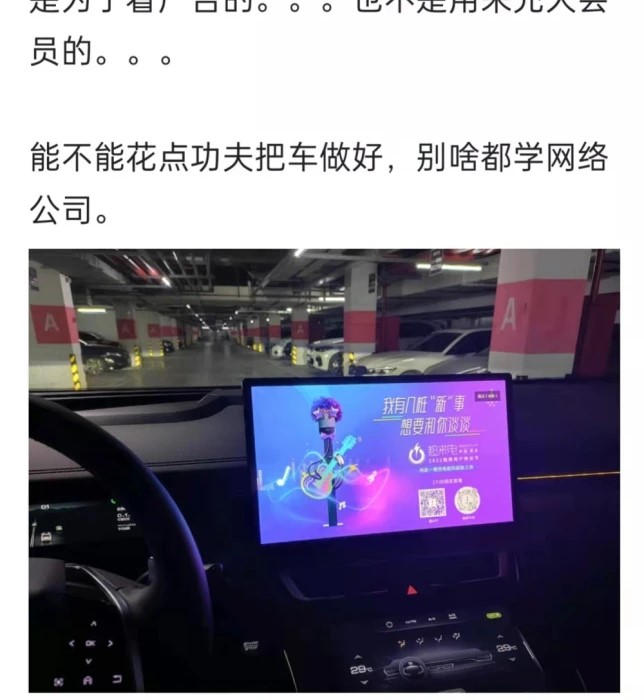 该车主在社交媒体上表示:“以前经常听到有人说,汽车屏幕弹出广告多么多么恶心,一直没见过,今天,第一次在行驶的汽车屏幕上看到了弹出的广告。”