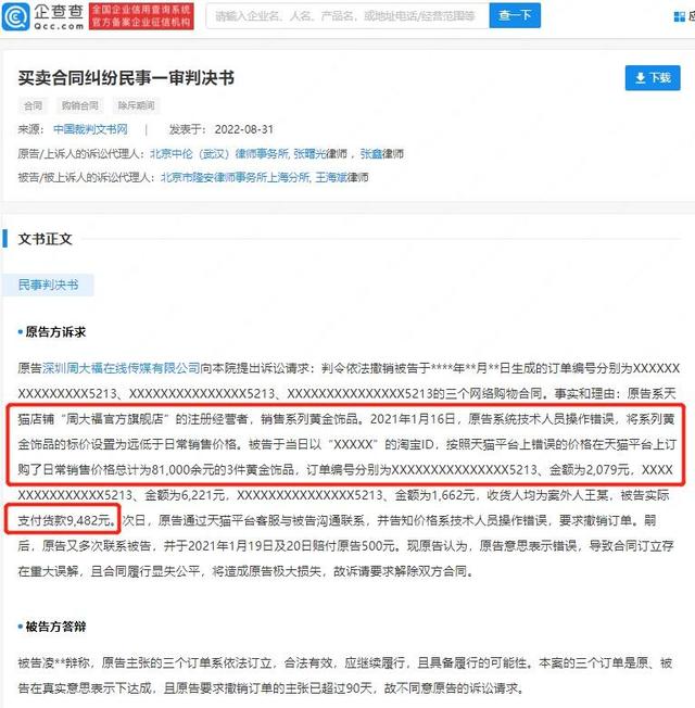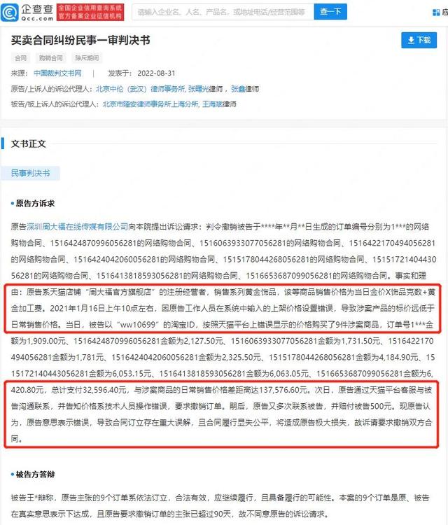 原告称,2021年1月16日,原告系统技术人员操作错误,将系列黄金饰品的标价设置为远低于日常销售价格。被告王某与凌某某于当日按照天猫平台上错误的价格在天猫平台上订购了日常销售价格总计约25万元的黄金饰品。