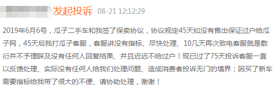 用户A在2019年6月6号,和瓜子二手车签了保卖协议,协议规定45天如果没有售出保证过户给瓜子网,45天后打瓜子客服,客服讲没有指标、尽快处理;10几天再次致电客服,敷衍、不予理睬、没有任何人回复结果!75天,客服一直表示会反馈,然而并没有任何人给处理问题。