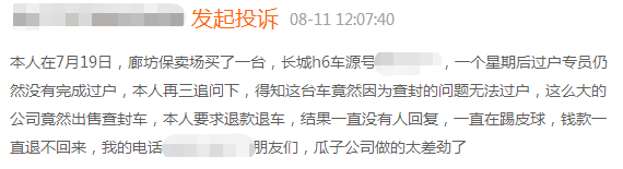 用户B在7月19日,廊坊保卖场买了一台长城h6,一个星期后过户专员仍然没有完成过户,用户再三追问下,得知这台车竟然因为查封的问题无法过户,这么大的公司竟然出售查封车,用户要求退款退车,结果一直没有人回复,一直在踢皮球,钱款一直退不回来。