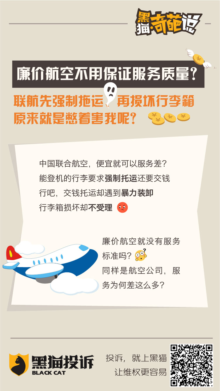 廉价航空不用保证服务质量?联航强制托运暴力装卸,行李损坏不处理