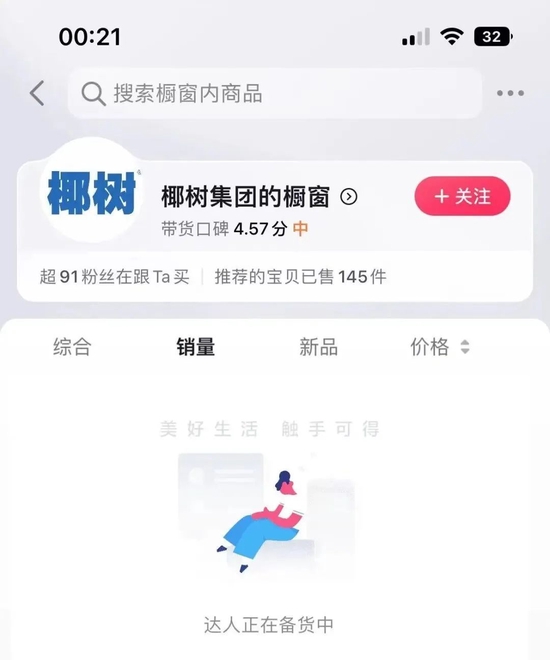 目前椰树集团抖音账号的橱窗已显示为空,已无带货商品,其推荐的商品已售145件。
