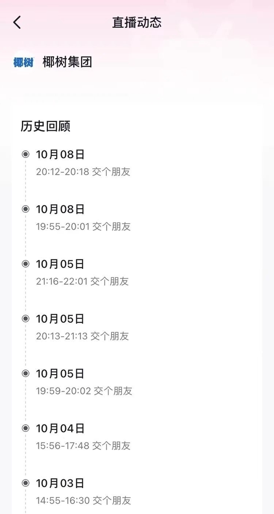 值得一提的是,10月2日,椰树集团直播一次中断;10月5日,椰树集团直播两次中断;6日、7日公司停播;直到10月8日晚,椰树集团再次直播,但依旧中断一次。