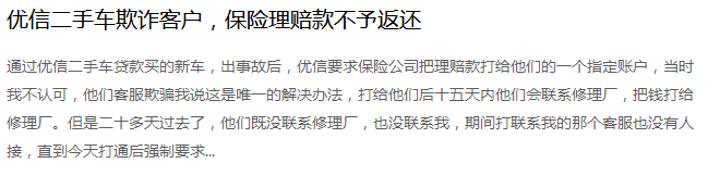 用户A先生表示:“一年的新车,在修理厂待了七个月。通过优信二手车贷款买的新车,出事故后,优信要求保险公司把理赔款打给他们的一个指定账户,当时我不认可,他们客服欺骗我说这是唯一的解决办法,打给他们后十五天内他们会联系修理厂,把钱打给修理厂。但是二十多天过去了,他们既没联系修理厂,也没联系我,期间打联系我的那个客服也没有人接,直到今天打通后强制要求我提前结清剩余六万多的贷款才把理赔款给我,又跟我说这是什么唯一的办法,现在又跟我说合同上写的清清楚楚,当时签合同的时候他们业务员也没让看合同,就是催促签字。”