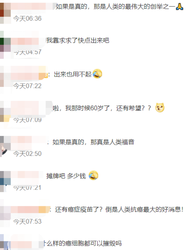 不少网友称:“如果是真的,那真是人类福音”、“不会不同部位的癌症需要不同的疫苗吧”、“20万虽然对我打工仔不便宜,但是出了我也愿意先给我妈打一针”......