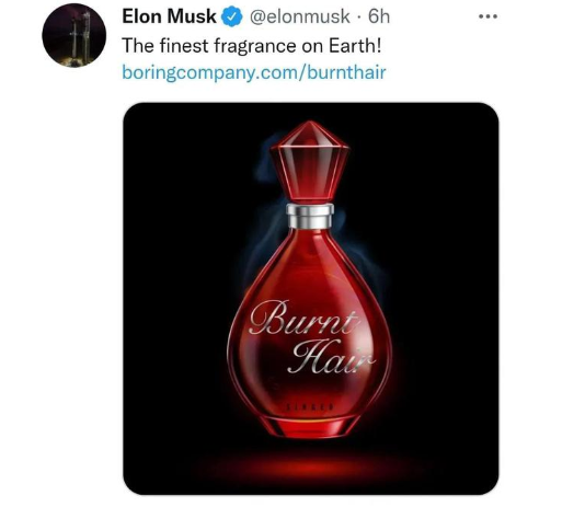 近日,全球首富、特斯拉CEO马斯克在旗下公司The Boring Company(以下简称“无聊公司”)开售一款名为“Burnt Hair”(烧焦头发)的香水,这瓶香味被官方描述为“令人反感的欲望”、“能让你在人群中脱颖而出”的奇葩香水,售价高达100美元(约合人民币718元),几小时就卖出一万瓶,迅速收割100万美元。