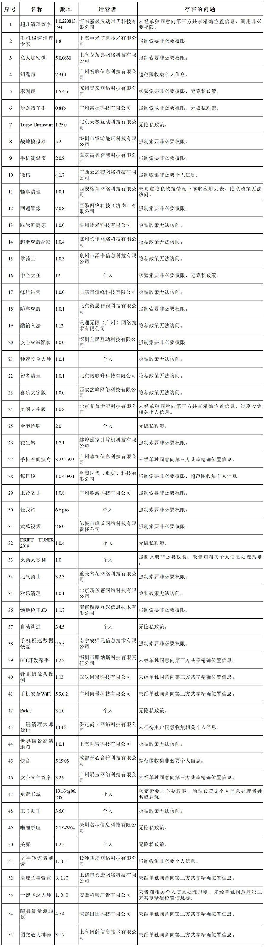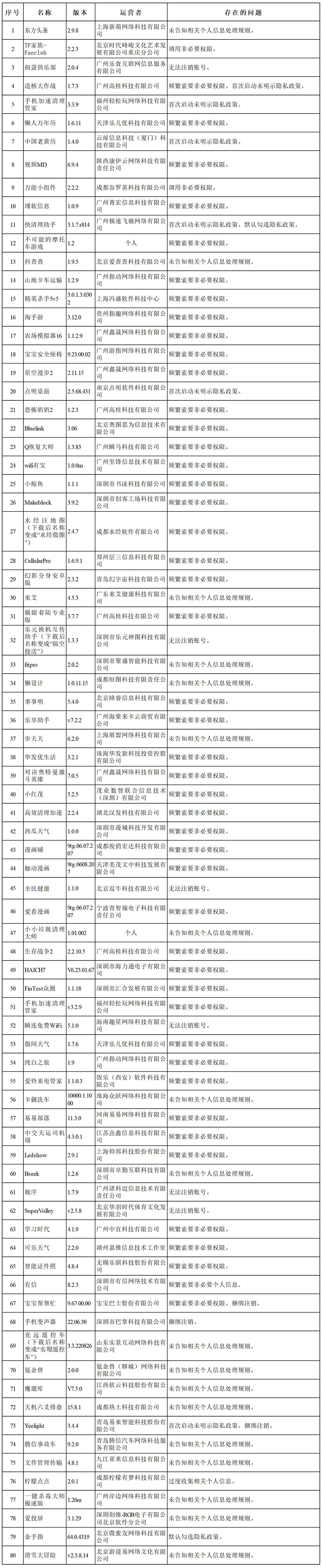 经查,“超凡清理管家”等55款App存在强制索要非必要权限、未经单独同意向第三方共享精确位置信息、无隐私政策、超范围收集上传通讯录等问题,违反《个人信息保护法》等法律法规规定,性质恶劣,依法予以下架处置;“东方头条”等80款App存在频繁索要非必要权限、首次启动未提示隐私政策、未告知相关个人信息处理规则、默认勾选隐私政策、无法或难以注销账号等问题,违反《个人信息保护法》等法律法规规定,依法责令限期1个月完成整改,逾期未完成整改的,依法予以下架处置。
