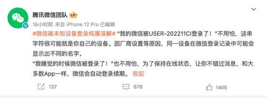 腾讯微信团队表示:“我的微信被USER-202211CI登录了!”不用怕,这串字符很可能就是你自己的设备。因厂商设置等原因,同一设备在微信登录记录中可能会显示出不同的名字。