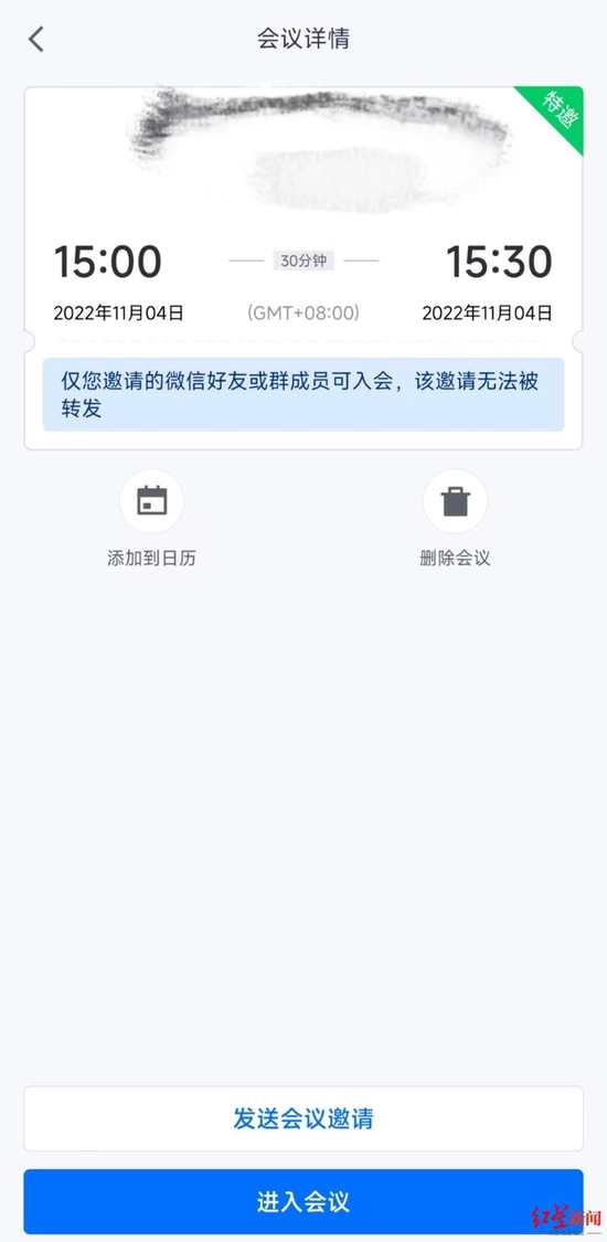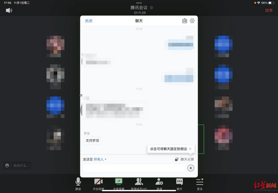 11月4日,红星新闻记者测试了腾讯会议、钉钉和飞书等几款常见的会议软件,看其在会前、会中、会后对网课入侵者的预防和制止性措施。