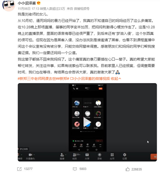 “我的妈妈结束网络直播课后独自倒在了家里,两天后被发现并确认死亡,然而凶手们至今仍隐藏于茫茫网络之中,请大家帮帮我!”11月2日凌晨,新郑市第三中学高一年级历史教师刘韩博的大女儿在网络上发出求救信息,请网友帮忙寻找在网课上网暴母亲的元凶。