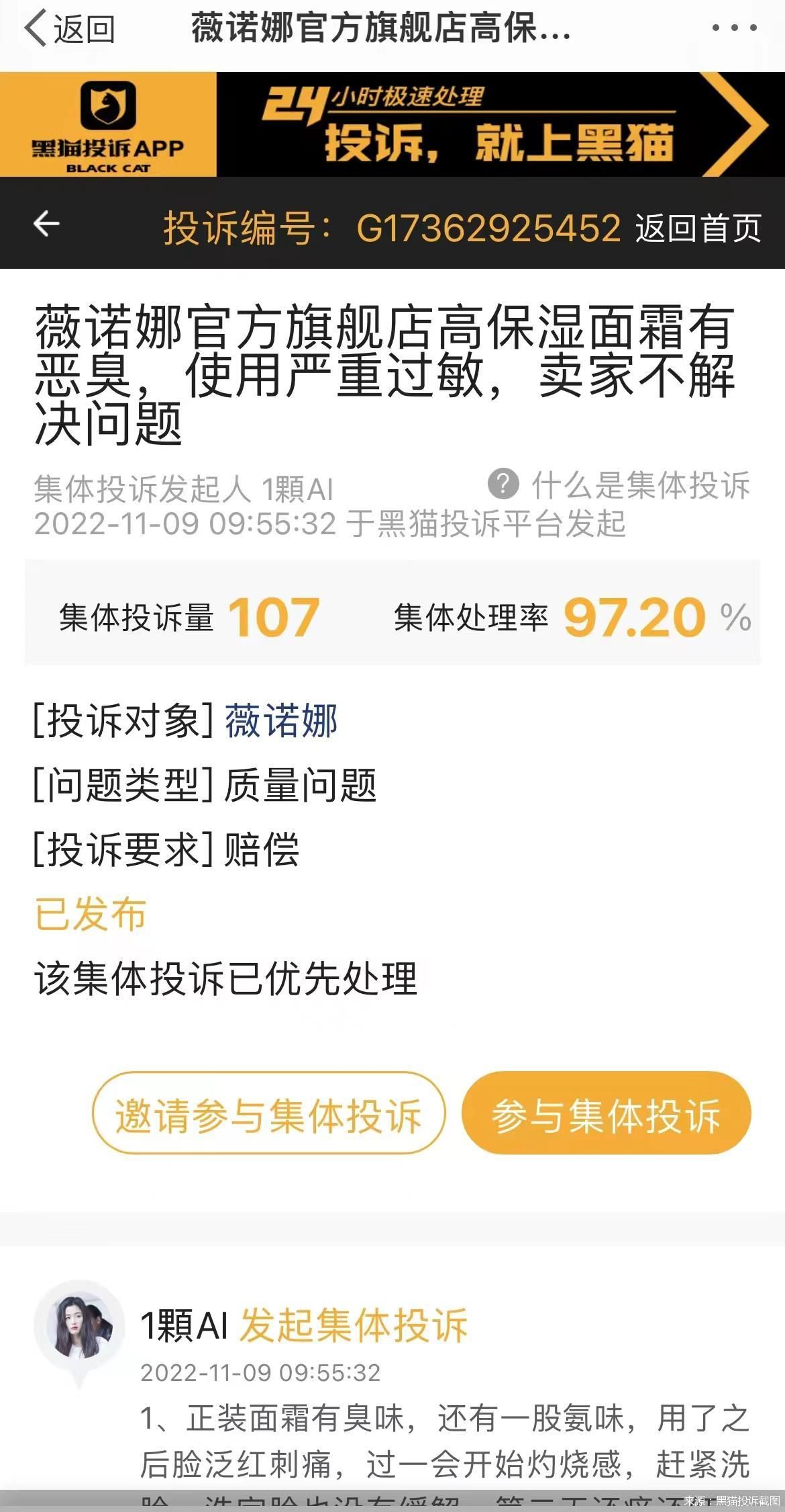 目前,在黑猫投诉平台,投诉“薇诺娜高保湿修护面霜”发臭、使用过敏的消费者超100人,小红书薇诺娜面霜维权群1中有500人维权,群2中有117人维权。
