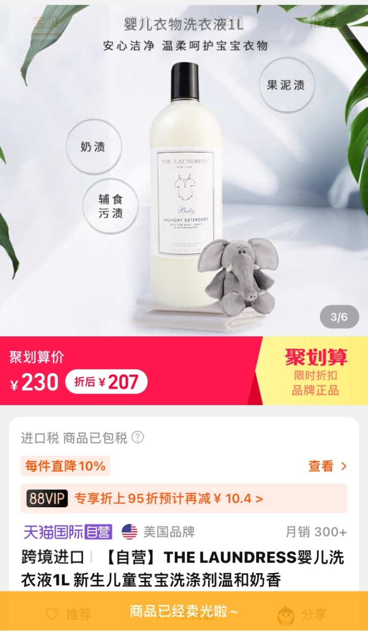 记者在天猫国际自营查了下价格,一瓶1000ML的The Laundress婴儿洗衣液聚划算折后价207元。