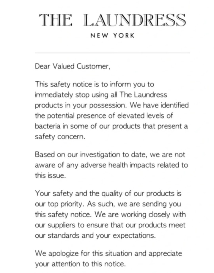 都市快报讯 今天上午,有网友在社交平台爆料,美国高端衣物护理品牌The Laundress突然官宣发出声明:建议用户立即停止使用品牌旗下全线产品,原因是“可能微生物超标”。