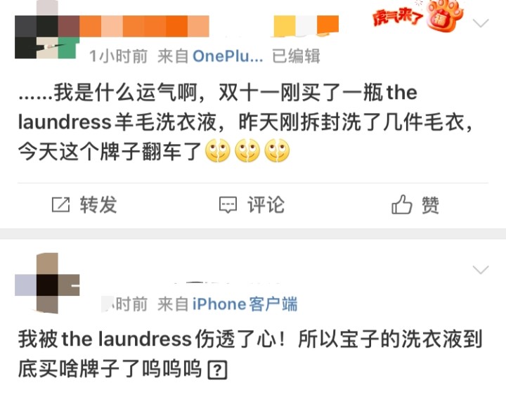 在微博上,关于The Laundress的实时词条也持续增加。有不少网友表示:“自己已经用了好多年了,没想到突然翻车”,还有不少网友吐槽:“刚刚在双11囤了一堆,这下怎么办……?”