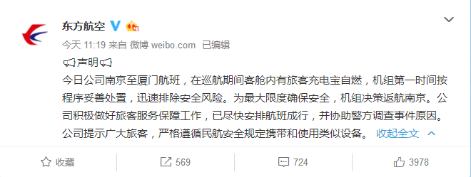 今日,东方航空通报,一架从南京至厦门的东航航班,在巡航期间客舱内有旅客充电宝自燃,机组决策返航南京,已平安落地。