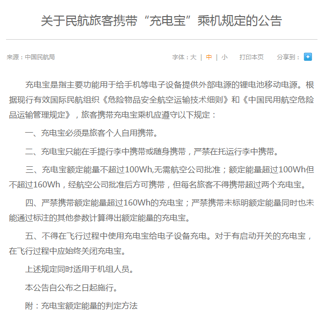 为此,在2014年8月7日中国民用航空发布了关于民航旅客携带“充电宝”乘机规定的公告(知识点):