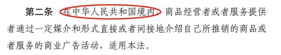 但问题是,《广告法》第二条又定义了广告法适用范围是中华人民共和国境内。