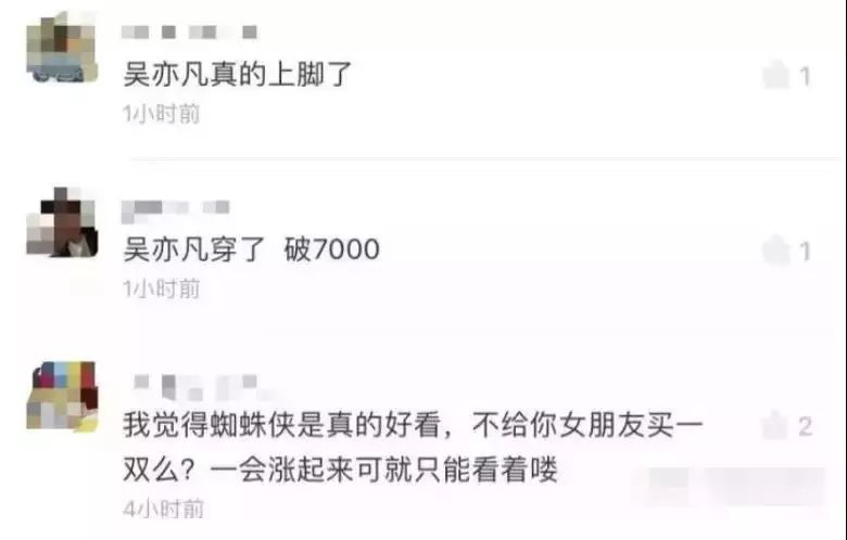 吴亦凡上脚了AJ1蜘蛛侠后,该款鞋子短短一小时内价格上涨了5倍左右。