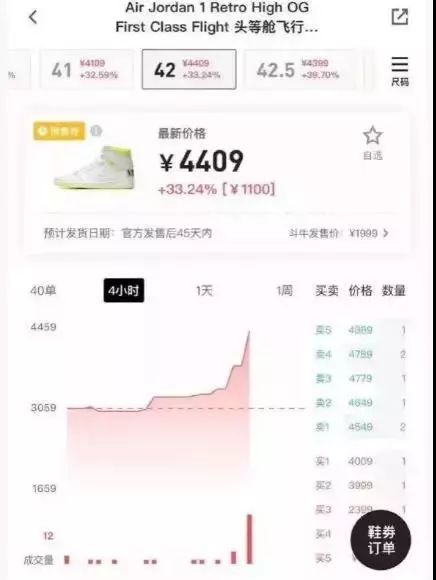 在分时图上,一双鞋的价格在短短几个小时内飙涨近50%,并且成交量急速放大。
