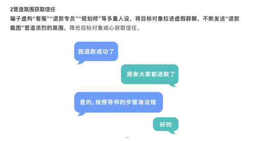 骗子虚构“客服”“退款专员”“规划师”等多重人设,将目标对象拉进虚假群聊,不断发送“退款截图”营造浓烈的氛围,降低目标对象戒心获取信任。