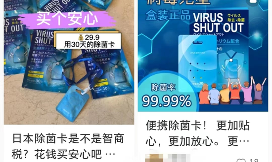 在淘宝、拼多多等电商平台,在搜索框输入“消毒卡”“除菌卡”等关键词后会弹出五花八门的防护产品。有号称“除菌率达99.9%”的“日本除菌卡”,有宣称防新冠病毒的“消毒棒”。淘宝平台有一款“日本除菌卡”月销量超4000+,而在拼多多平台拼单超1万件的防疫“除菌卡”不在少数。在小红书平台,关于“消毒卡”的相关笔记达600+篇,不少网友表示已经购买或准备购买。