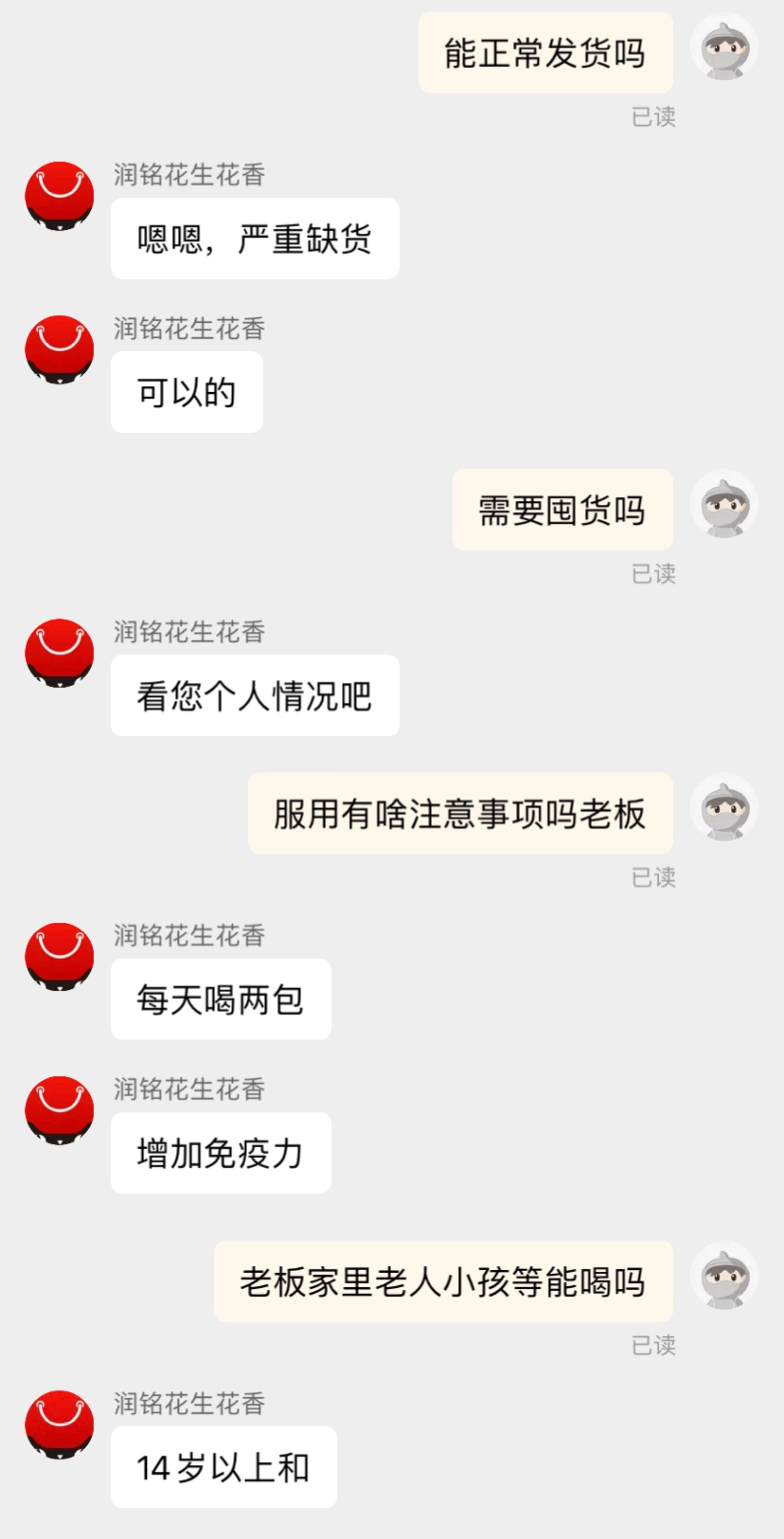 贝壳财经记者随机挑选了两款产品,以消费者名义咨询商家。其中一款“百年华仁张仲景莲花清温茶”产品的卖家告诉记者,现在“连花清瘟”类产品“严重缺货”,但自家还有现货,建议记者根据个人情况选择是否囤货。在记者咨询产品作用和服用注意事项时,商家称,“每天喝两包,增加免疫力,14岁以上喝。”