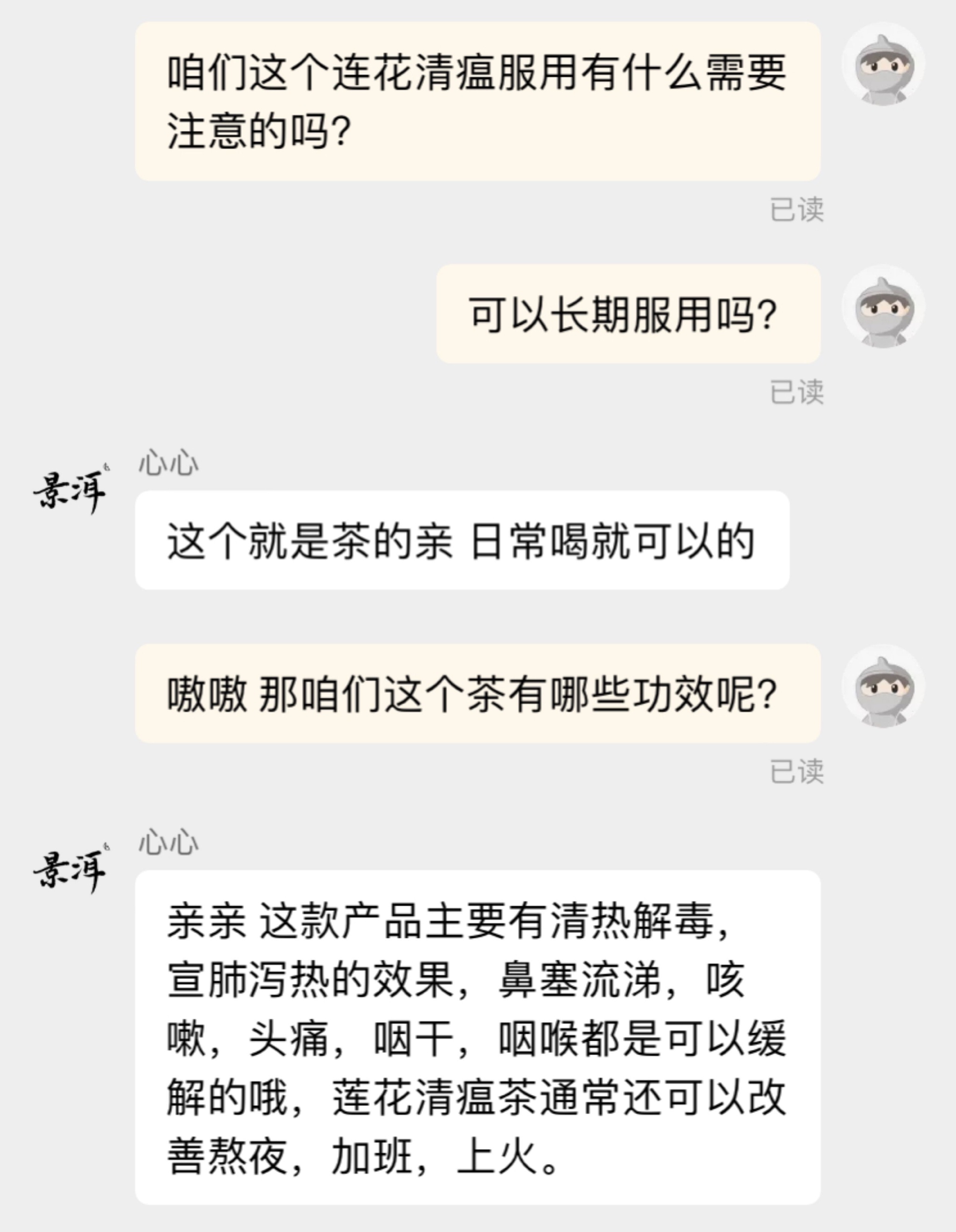 为了推销产品,一些商家甚至直接列上“为什么喝莲花清温茶”的理由:“莲花清温茶与颗粒和胶囊的配方几乎一样都是那些药食同源的中草药所以效果也雷同,我们是以预防为主为了提高抵抗力,生病了在吃是有点晚不如直接预防抗得住,药不能没病天天吃呀,但是茶可以天天喝,从而提高抵抗力。”