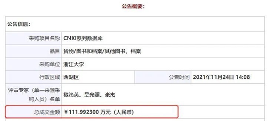 复旦大学CNKI数据库2022年成交价82.5万元、中国矿业大学(北京)CNKI数据库2022年成交价约107万元、浙江大学拟采购CNKI数据库预算是112万元、西南民族大学CNKI数据库2022年成交价116万元、北京科技大学CNKI数据库2022年成交价130万元……