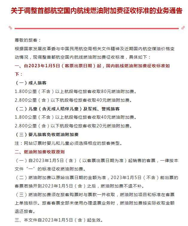 另据媒体报道,12月30日,机票代理平台接到多家国内航司消息:自2023年1月5日(出票日期)起,调整国内航班燃油附加费征收标准,800公里及以下航段成人旅客的燃油附加费降至40元,800公里以上航段降至80元。