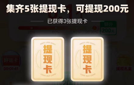 5张提现卡集合到一起,可以提现,最后,我得了4张,还剩1张怎么也无法拿到。