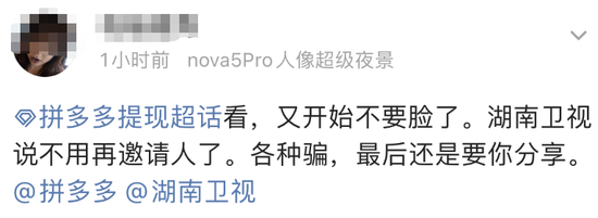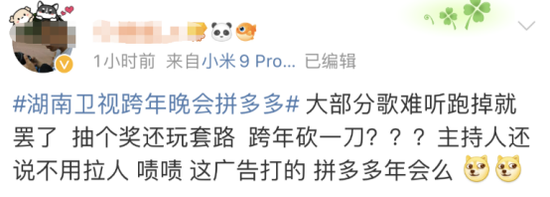 这一次,拼多多大手笔,分别在湖南卫视和央视及B站的晚会上成为主要冠名商。晚会里提及拼多多的频率多到被网友吐槽:这是拼多多年会吧?