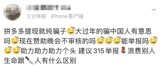 “特别想打人!”小Y到凌晨还耿耿于怀,“那些主持人是不是应该道歉?电视台算不算为诈骗背书?为什么要助长这种恶劣广告商的嚣张气焰?拼多多会不会受到相关部门的惩罚?”