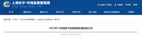 近日,上海长宁市场监督管理局发布2022年12月抽检不合格核查处置信息公示。