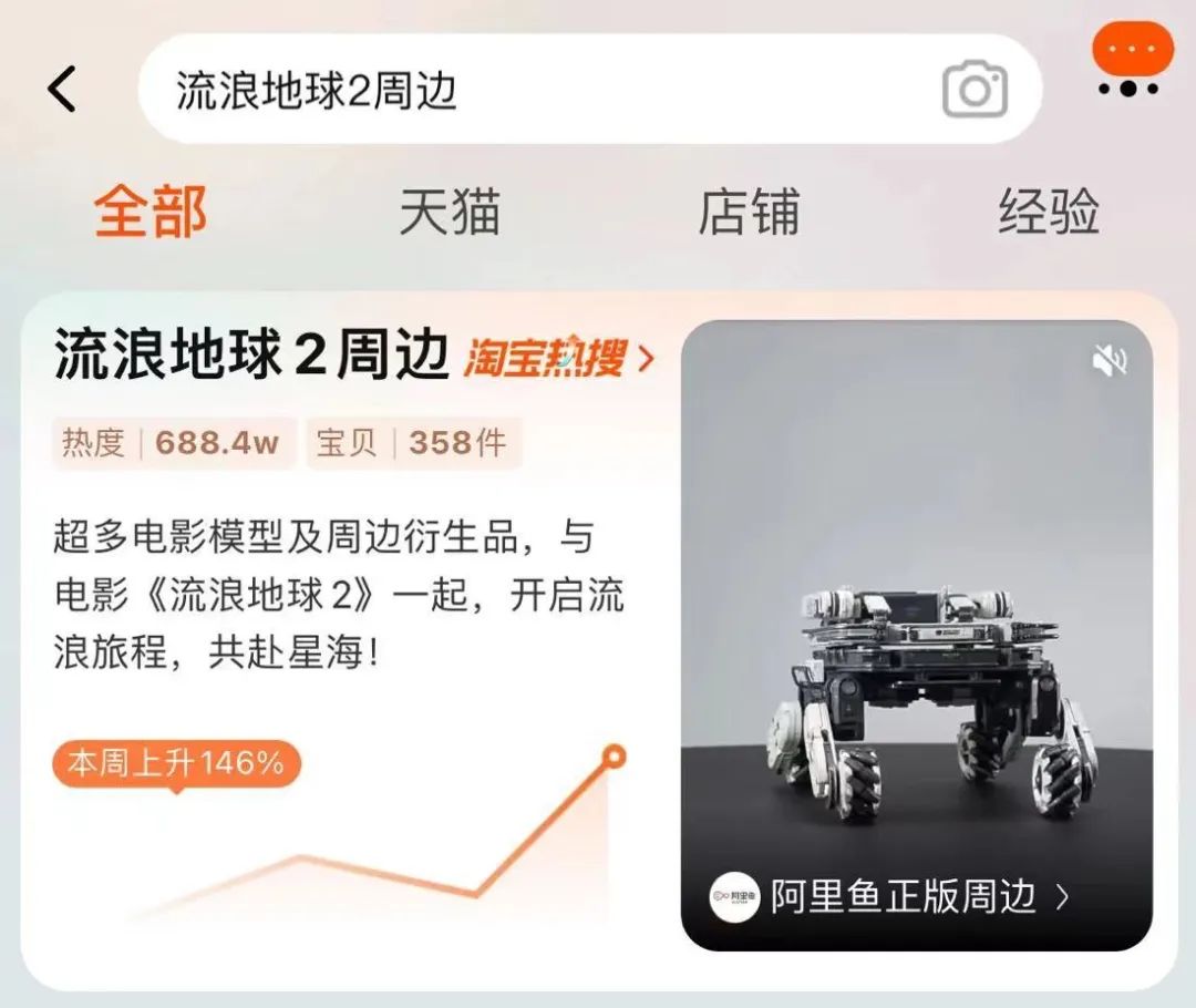 电影周边年年有,今年春节特别火。随着《流浪地球2》的持续升温,周边衍生品持续火爆。在淘宝平台上,“流浪地球2周边”搜索量增长超146%,登上淘宝热搜,相关产品达358件。