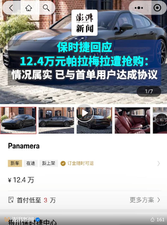 1月31日,记者就此事致电银川保时捷中心,保时捷销售端一位工作人员表示,网传消息基本属实。工作人员告诉记者:“保时捷小程序上架的车辆实际库存为1台,首单用户购买成功后,后面下单的用户会自动判定为无效订单,48小时内退还押金。”就网友质疑的该问题是否属于系统漏洞时,工作人员表示,“这种问题也是第一次出现,接下来会将问题反馈给负责小程序的相关工作部门。”